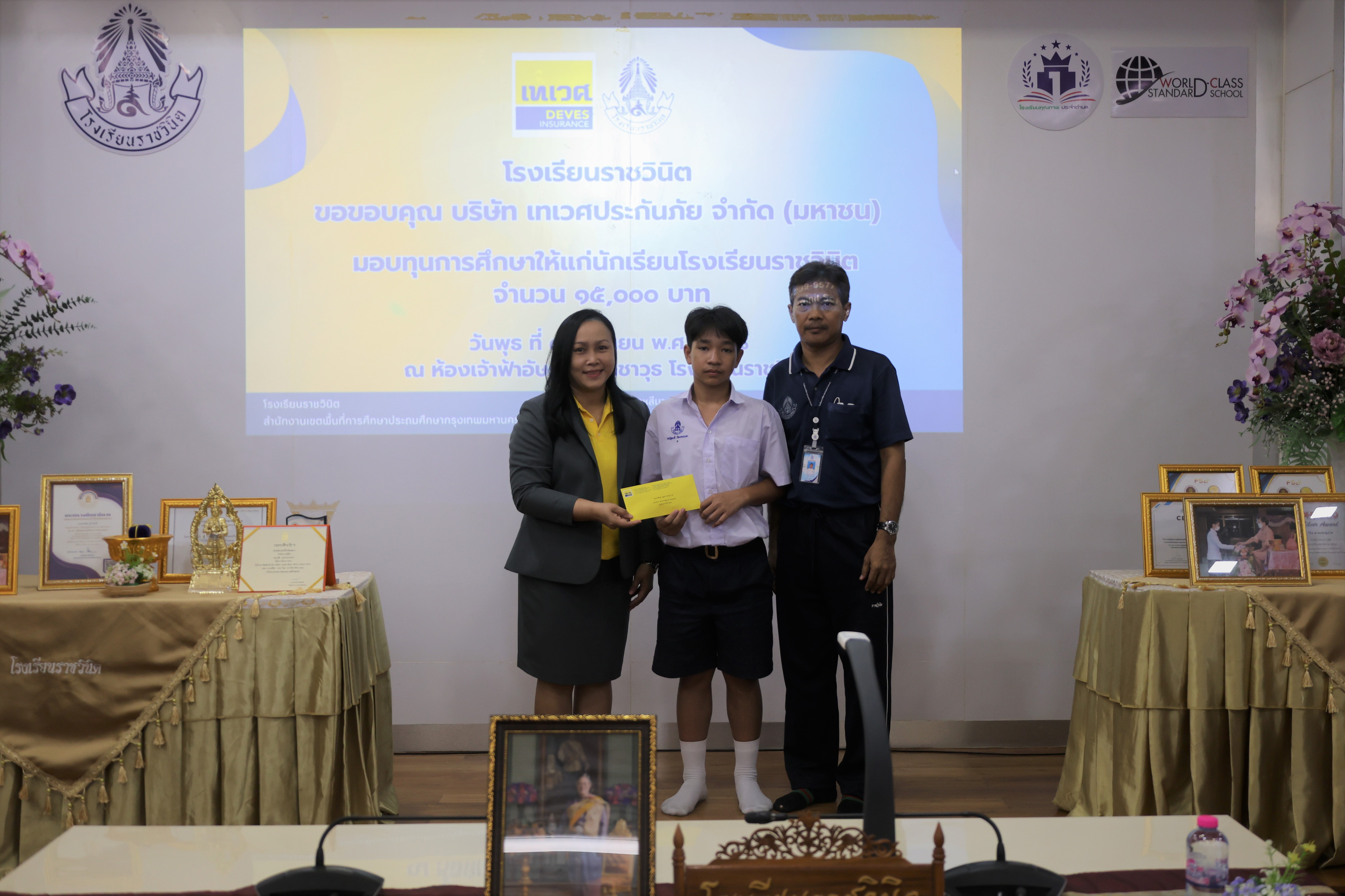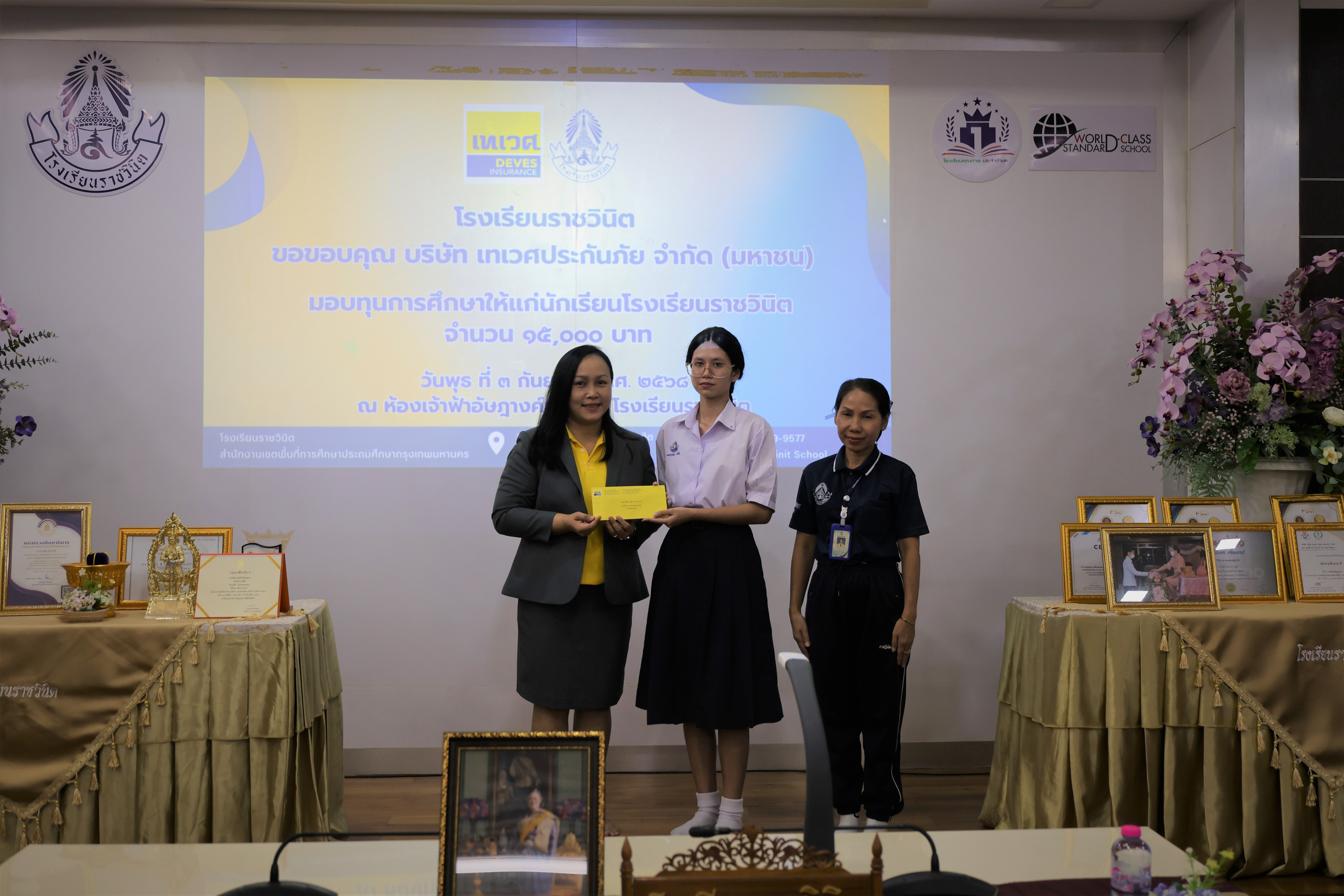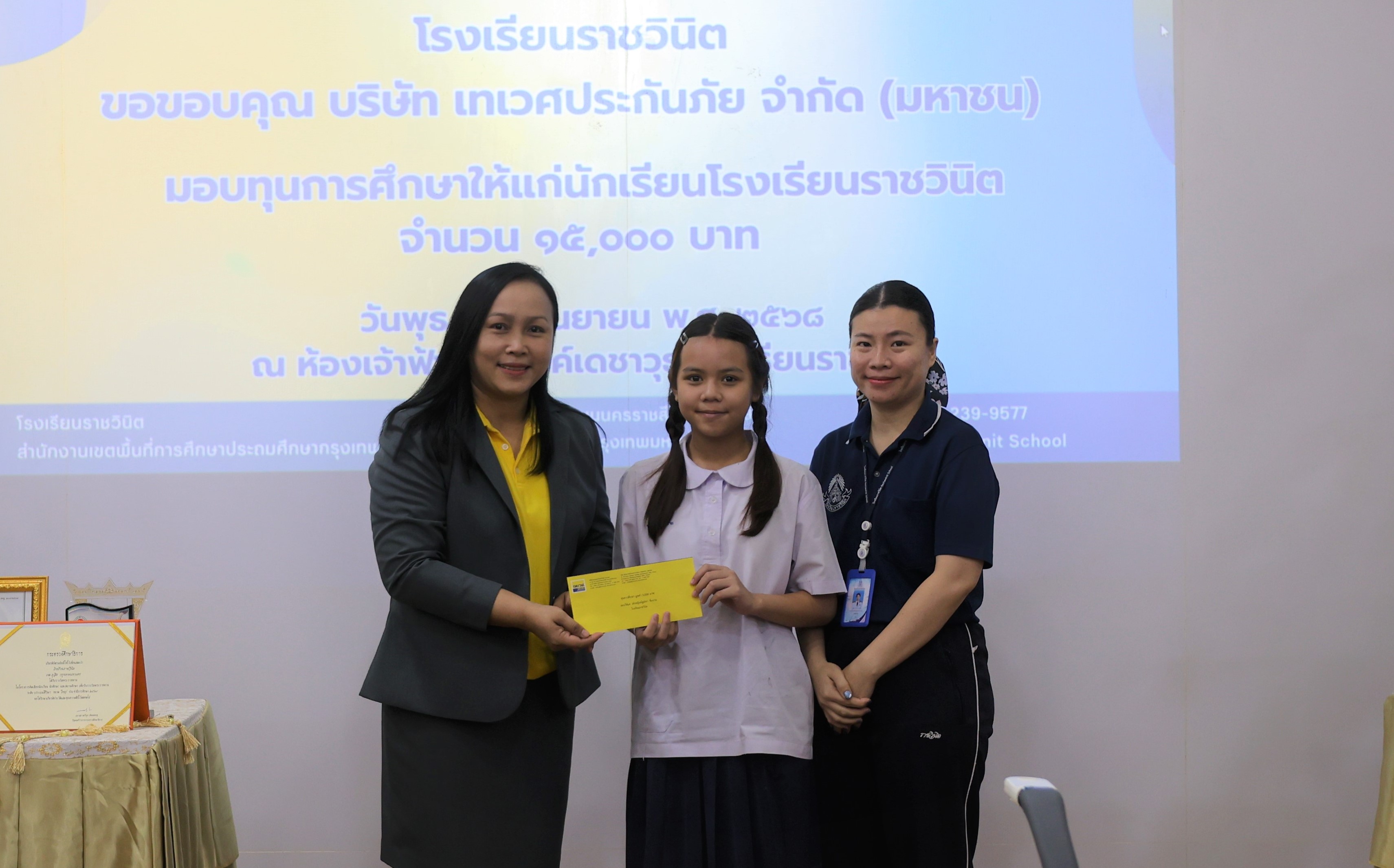 ในการนี้ คุณฤมลรัตน์ พุทธิชัยศิริ ผู้อำนวยการฝ่ายบัญชีและการเงิน และคุณสิริพร จันทร์แก้ว ผู้อำนวยการสำนักนิติกรรมประกันภัย ได้รับเกียรติเป็นผู้แทนบริษัทฯ ในการมอบทุนการศึกษาดังกล่าว เพื่อร่วมส่งต่อโอกาสทางการศึกษาและแบ่งเบาภาระของผู้ปกครอง พิธีมอบทุนจัดขึ้น ณ ห้องเจ้าฟ้าอัษฎางค์เดชาวุธ โรงเรียนราชวินิต และ ห้องเยาวมาลย์ โรงเรียนเทพศิรินทร์ ตามลำดับ โดยมีผู้บริหารสถานศึกษา คณะครู และนักเรียน ร่วมเป็นสักขีพยาน