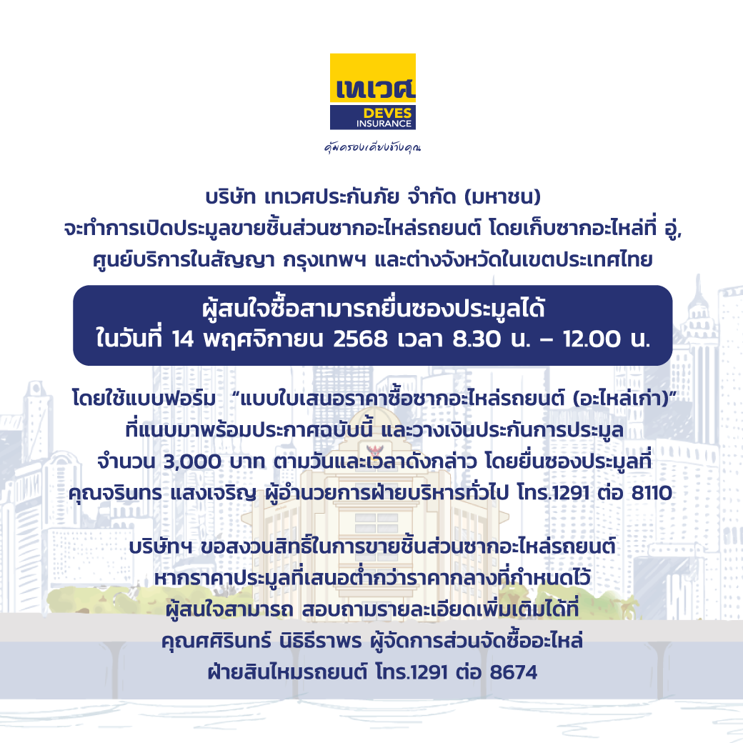 บริษัท เทเวศประกันภัย จำกัด (มหาชน) จะทำการเปิดประมูลขายชิ้นส่วนซากอะไหล่รถยนต์