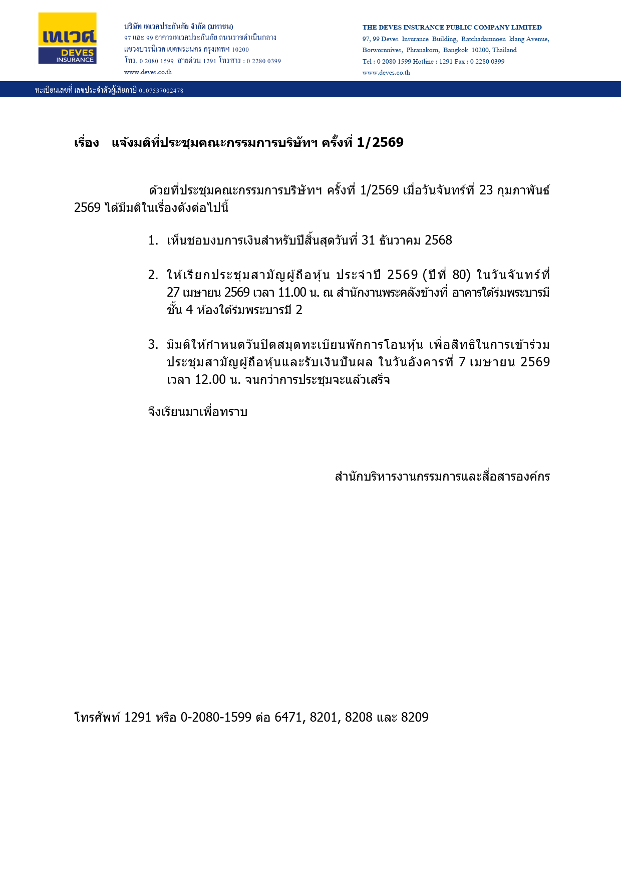 ประกาศแจ้งมติที่ประชุมคณะกรรมการบริษัทฯ ครั้งที่ 1/2569